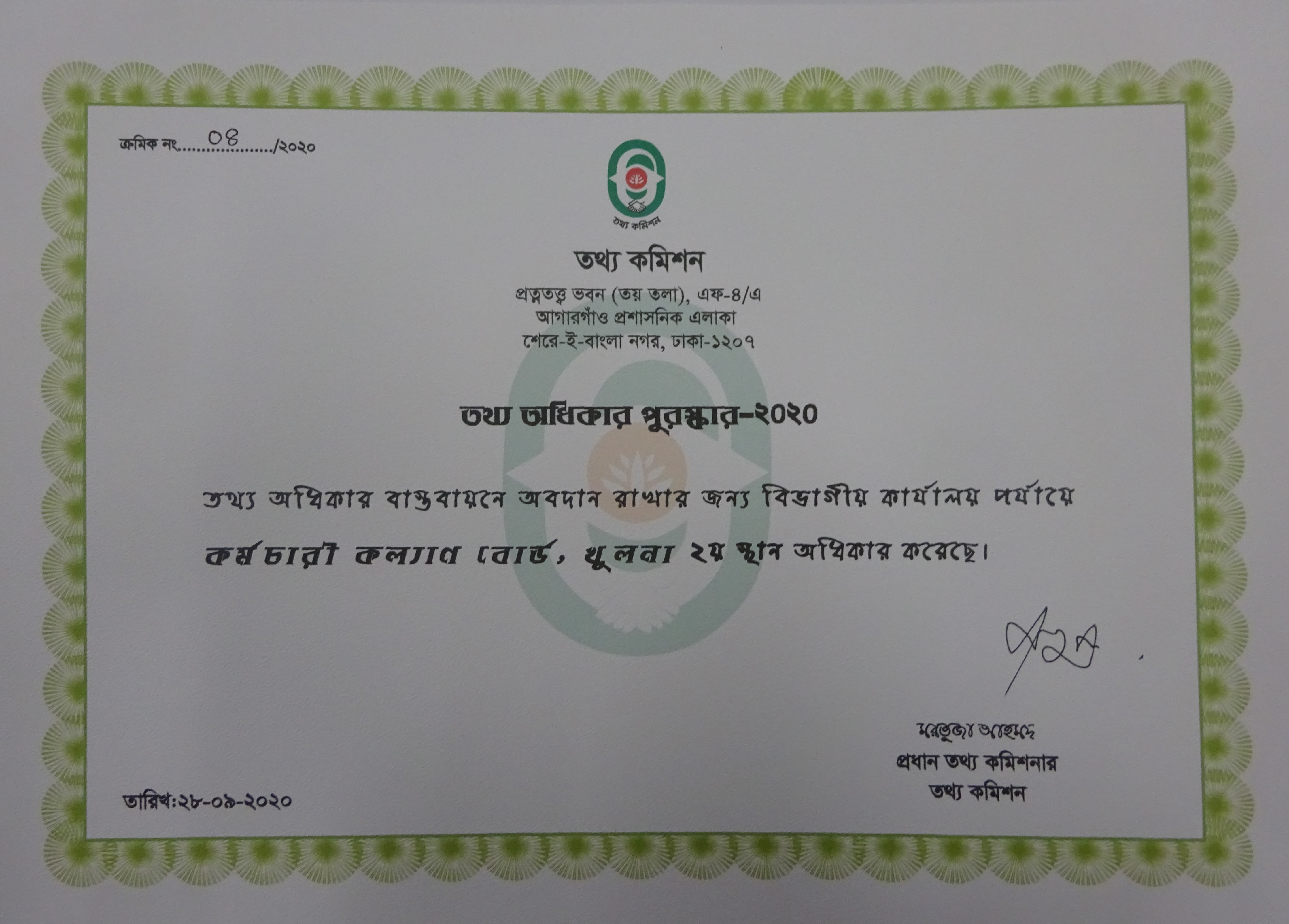 আর্ন্তজাতিক তথ্য অধিকার দিবস ২০২০ এ বাংলাদেশের শ্রেষ্ঠ বিভাগীয় অফিস পর্যায়ে কর্মচারী কল্যাণ বোর্ড,খুলনার ২য় স্থান অর্জন